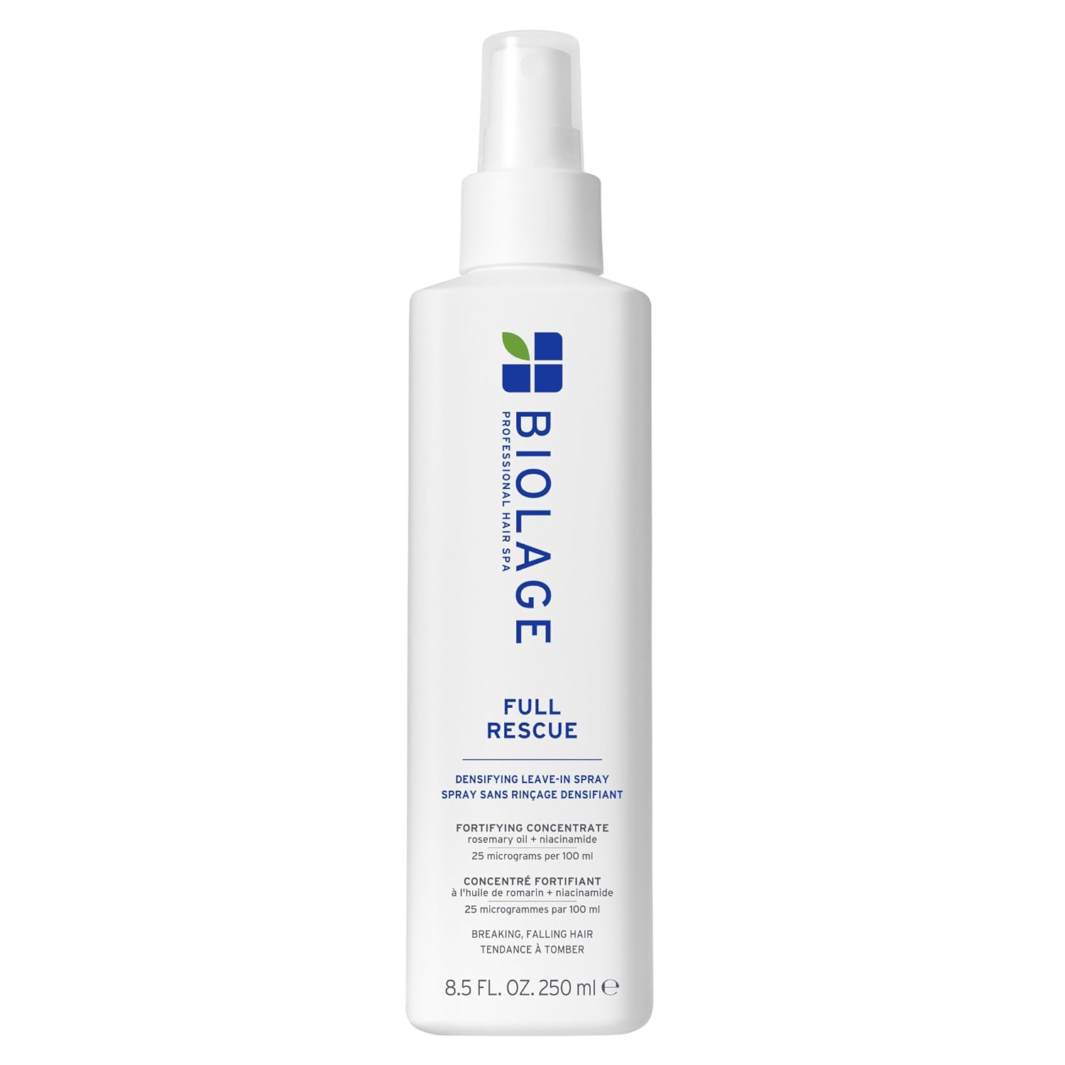 The Biolage Full Rescue Densifying Leave-In Spray (250ml) is a professional-grade treatment designed to fortify thinning hair, improve density, and protect against breakage. Enriched with biotin, zinc, and gluco-omega blend, this lightweight spray penetrates the hair fibre to strengthen from within, while providing instant softness, shine, and manageability.