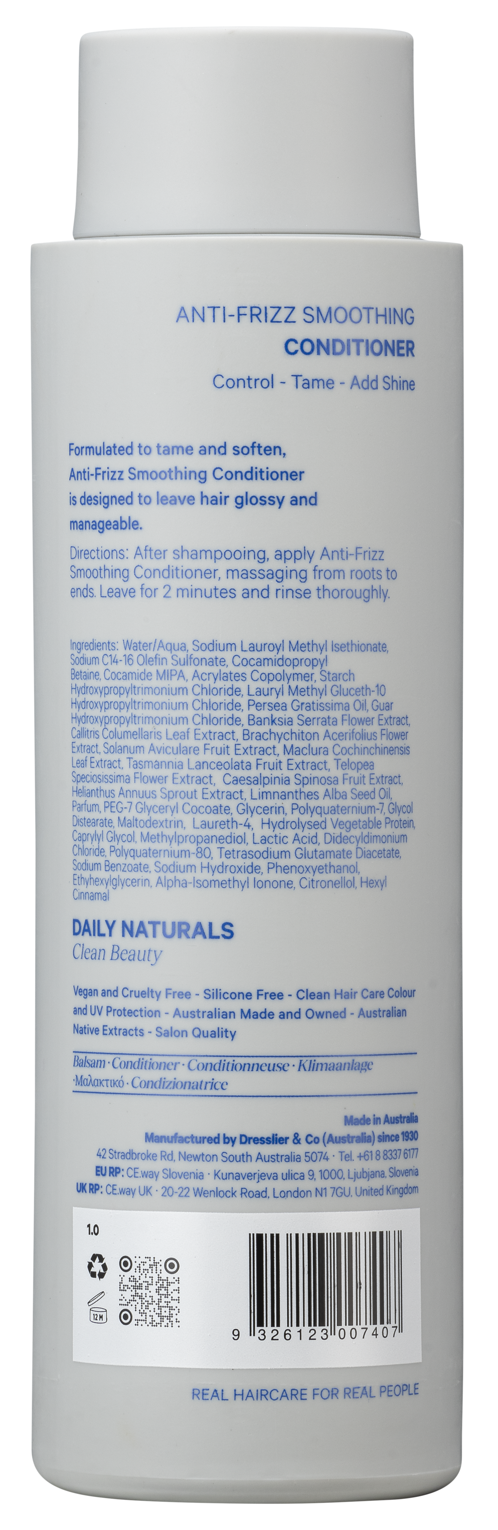 The Daily Naturals Anti-Frizz Smoothing Conditioner is a professional-grade conditioner designed to tame frizz, smooth flyaways, and restore hydration for silky, manageable hair. Enriched with natural plant-based extracts and nourishing oils, this lightweight formula detangles effortlessly while sealing the cuticle to lock in moisture and shine.