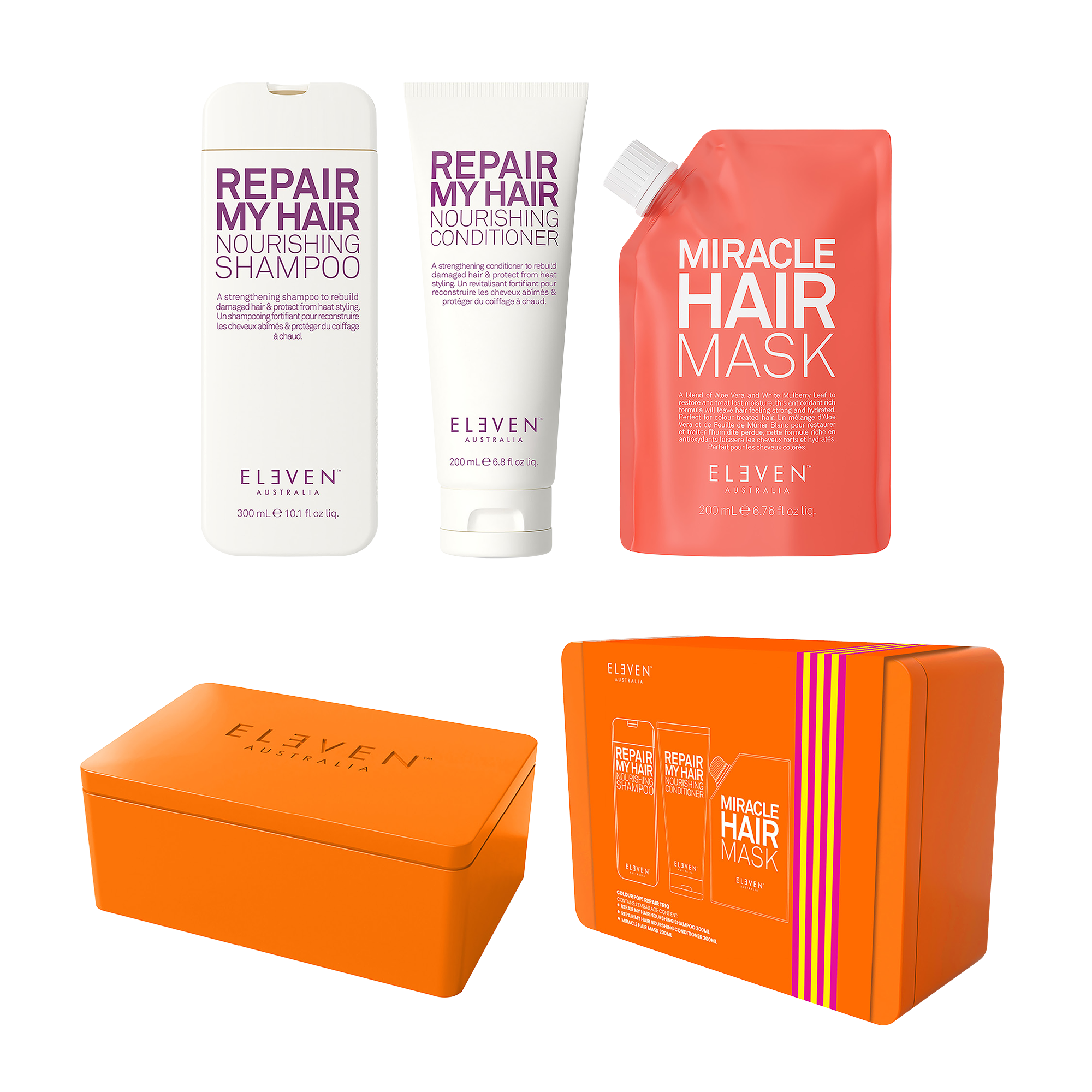 The Eleven Australia Repair Trio Gift Pack is a restorative haircare bundle designed to repair, nourish, and protect damaged or chemically treated hair. Featuring the Repair My Hair Nourishing Shampoo (300ml), Repair My Hair Nourishing Conditioner (200ml), and the intensive Miracle Hair Mask (200ml), this trio delivers salon-quality results by rebuilding hair strength, improving elasticity, and restoring shine. Whether your hair is stressed from heat styling, colouring, or environmental exposure, this set helps bring it back to life.