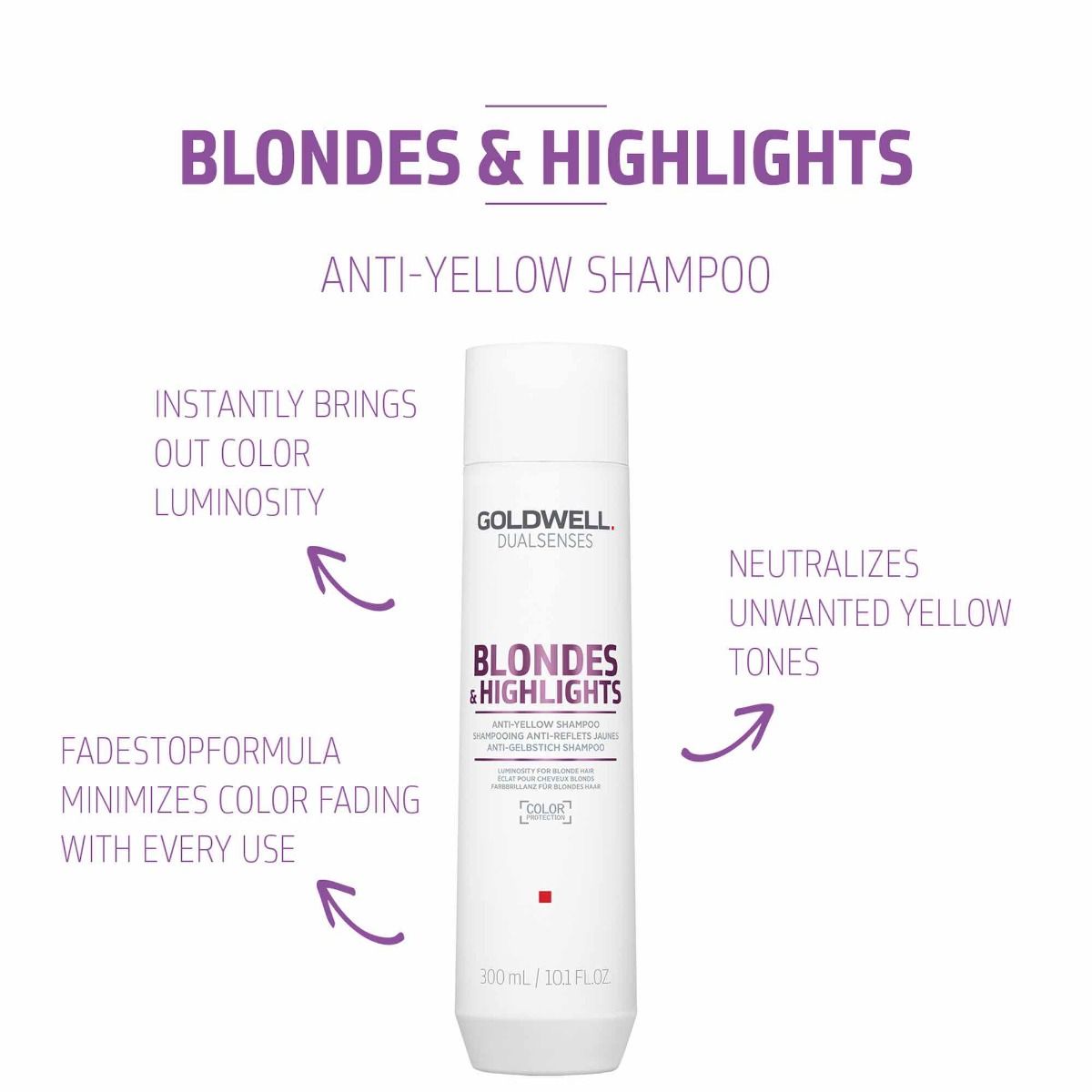 Goldwell Dualsenses Blondes & Highlights Anti-Yellow Shampoo (300ml) – gently cleanses while depositing violet pigments to counteract brassiness, leaving blonde and highlighted hair cool-toned and radiant.
