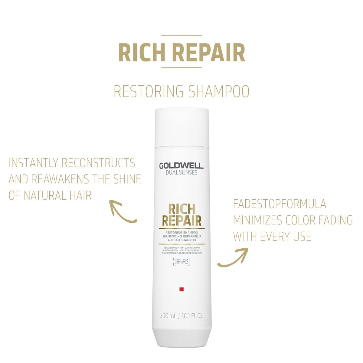 Goldwell Dualsenses Rich Repair Restoring Shampoo (300ml) – gently cleanses while repairing hair from within, leaving it soft and manageable.