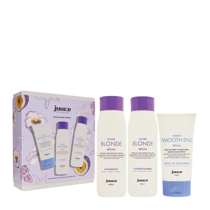 The JUUCE Silver Blonde + Smooth Enz Trio Pack is a professional-grade haircare bundle designed to neutralize brassiness, hydrate dry strands, and smooth frizz for blonde, bleached, or grey hair. This Australian-made, vegan-friendly set includes: