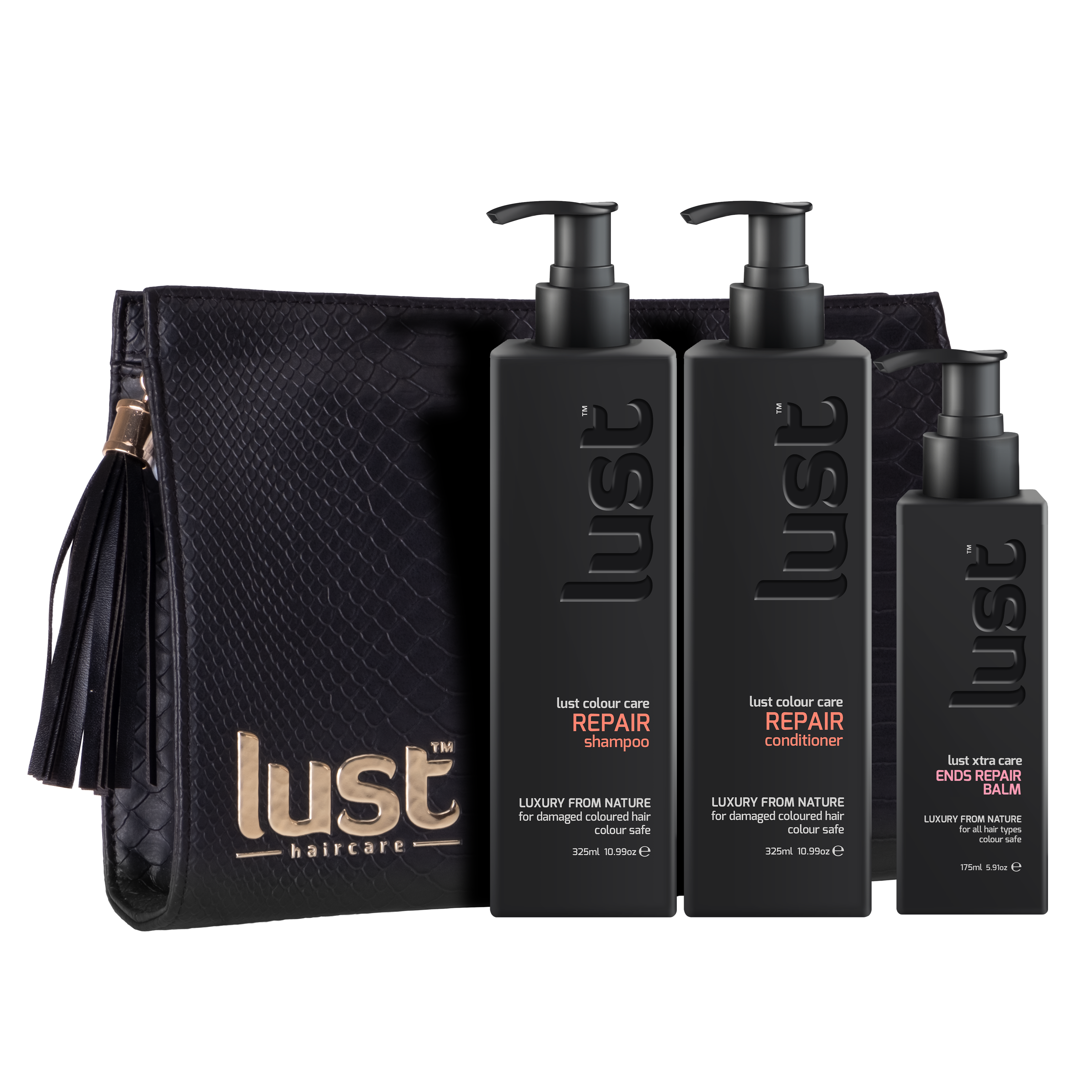 Lust Colour Care Repair Shampoo (325ml) – A gentle, colour-safe cleanser that detoxifies the scalp and strengthens weakened strands while preserving colour vibrancy.