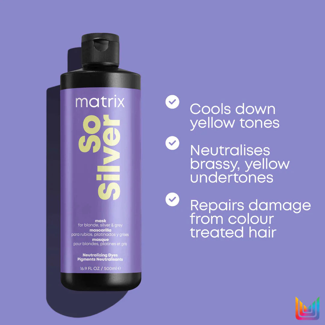 The Matrix So Silver Mask For Blonde, Silver & Grey (500ml) is a professional salon-quality deep conditioning mask designed to neutralize unwanted yellow tones while intensely nourishing blonde, platinum, silver, and grey hair. Infused with purple pigments and hydrating conditioners, this mask restores vibrancy, enhances cool tones, and leaves hair soft, shiny, and manageable. Perfect for weekly use, it delivers salon-quality toning and hydration in one step.