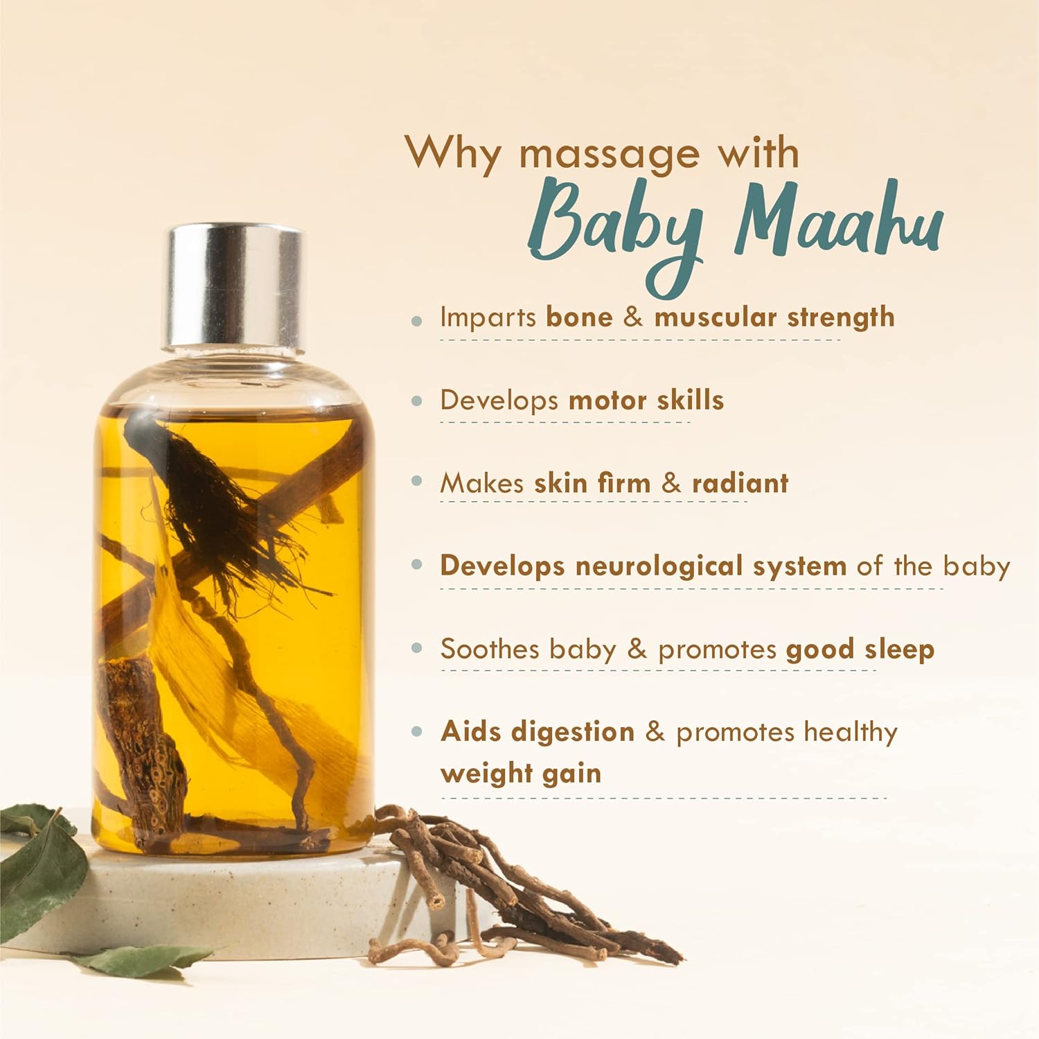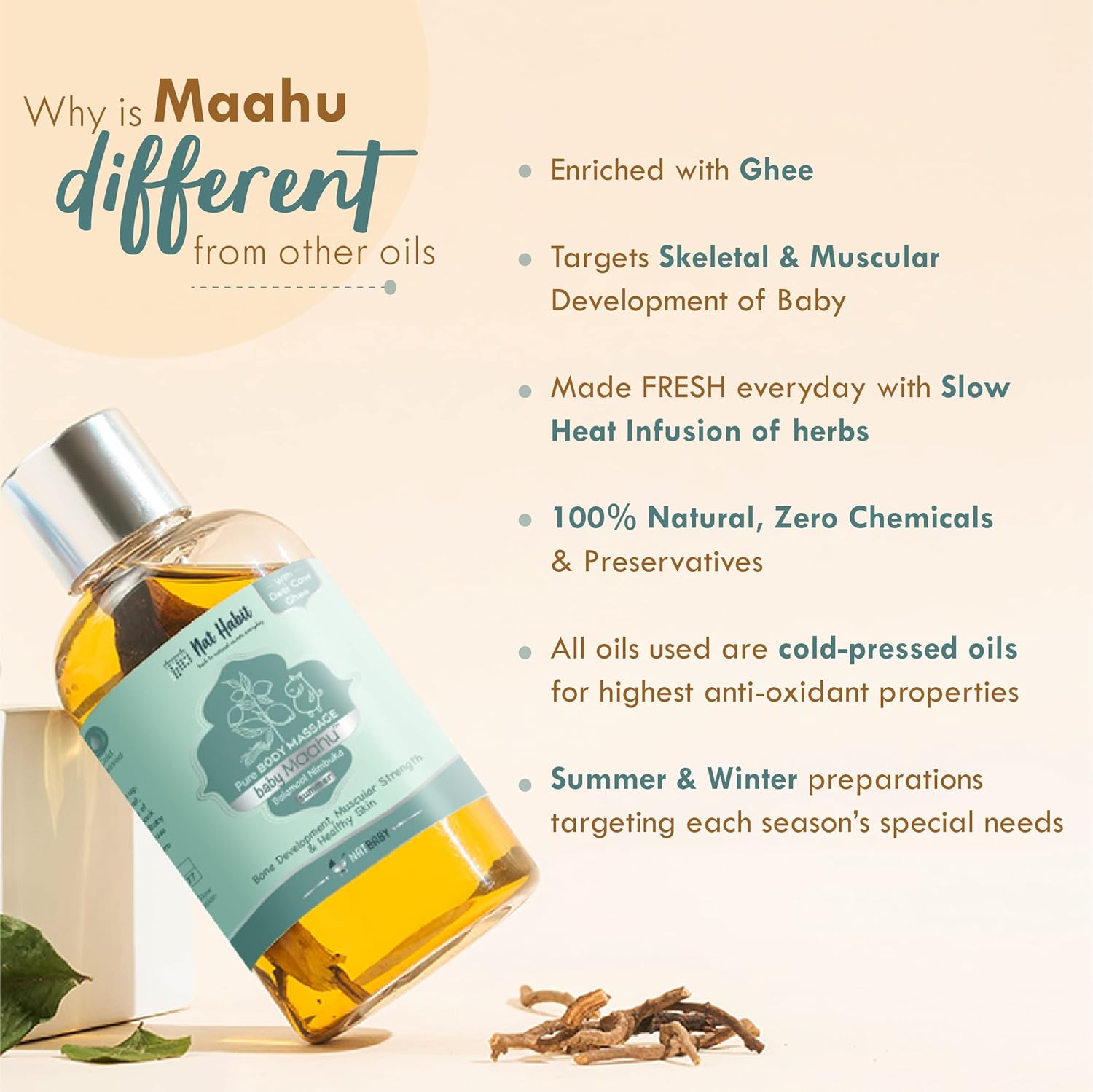 Can I use it on my baby’s scalp? It’s primarily for body massage. Use Nat Habit’s Dasabuti Scalp Oil for head massage.