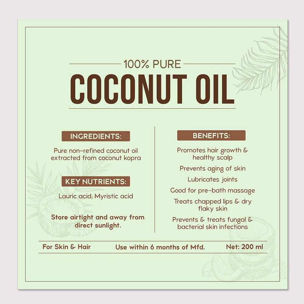 Nat Habit Pure Coconut Oil (200ml) is a 100% natural, cold-pressed oil extracted from high-grade coconut kernels sourced from Tamil Nadu and Kerala. Freshly prepared in Nat Habit’s Ayurvedic kitchen, this oil is non-refined, LLP-free, and free from chemicals, preservatives, paraffin, and mineral oils. Rich in lauric acid, antioxidants, and medium-chain fatty acids, it deeply nourishes skin and hair, supports joint health, and protects against infections. Whether you're looking for a pre-bath massage oil, a hair growth booster, or a skin-soothing remedy, this multipurpose elixir is your go-to solution.
