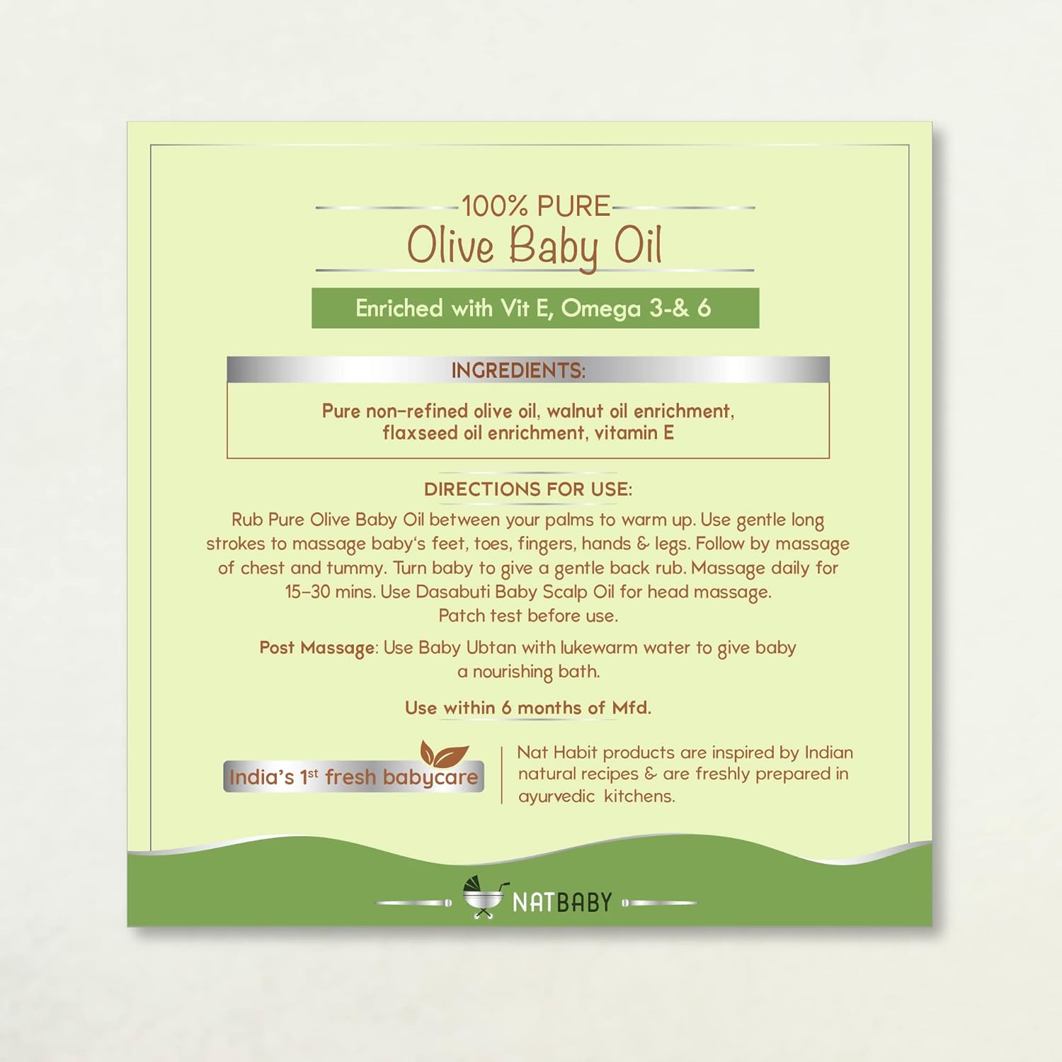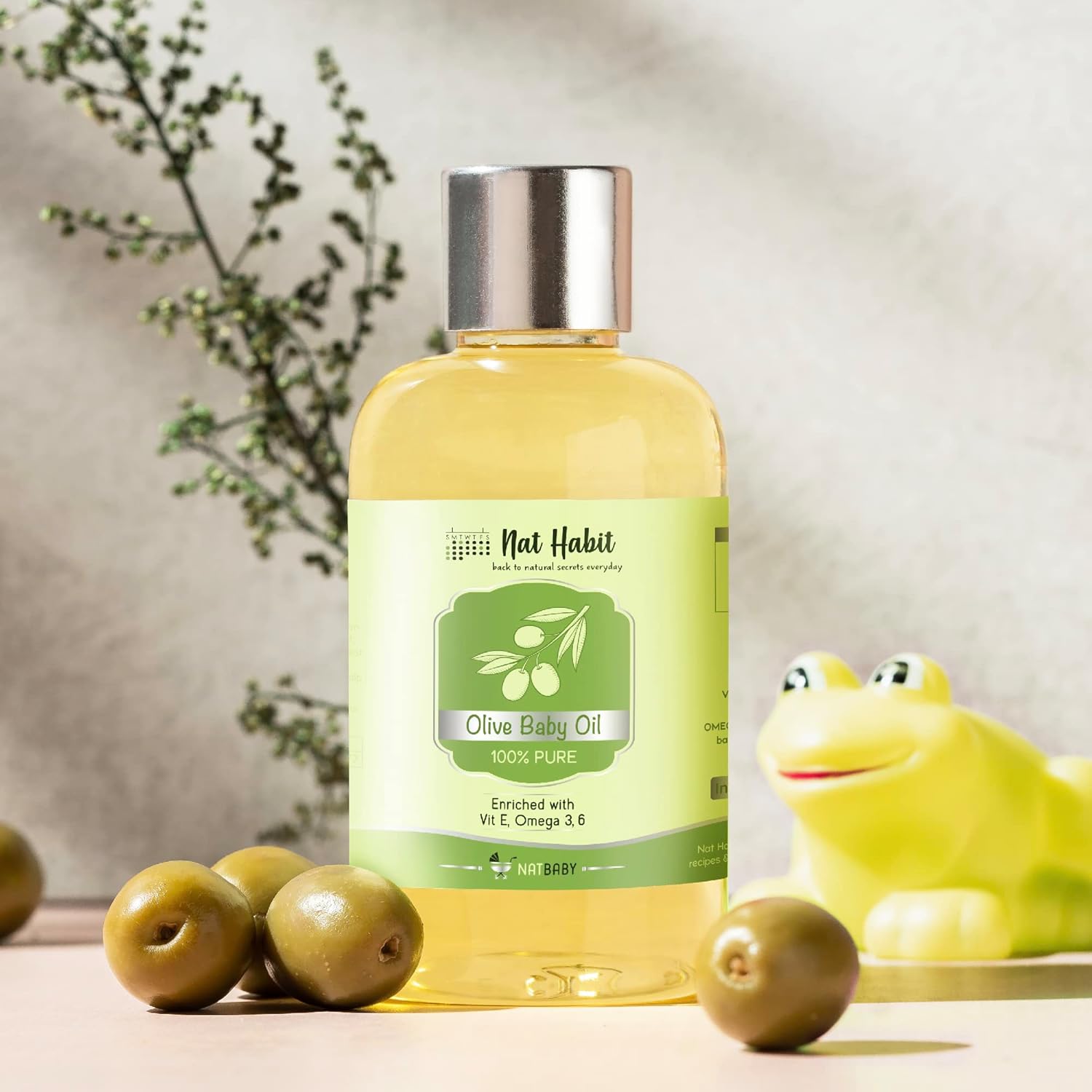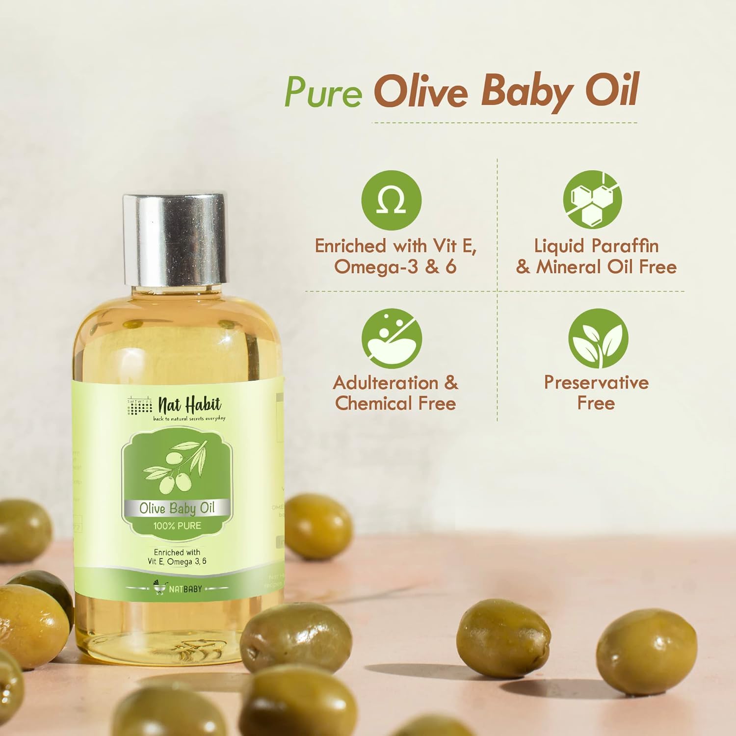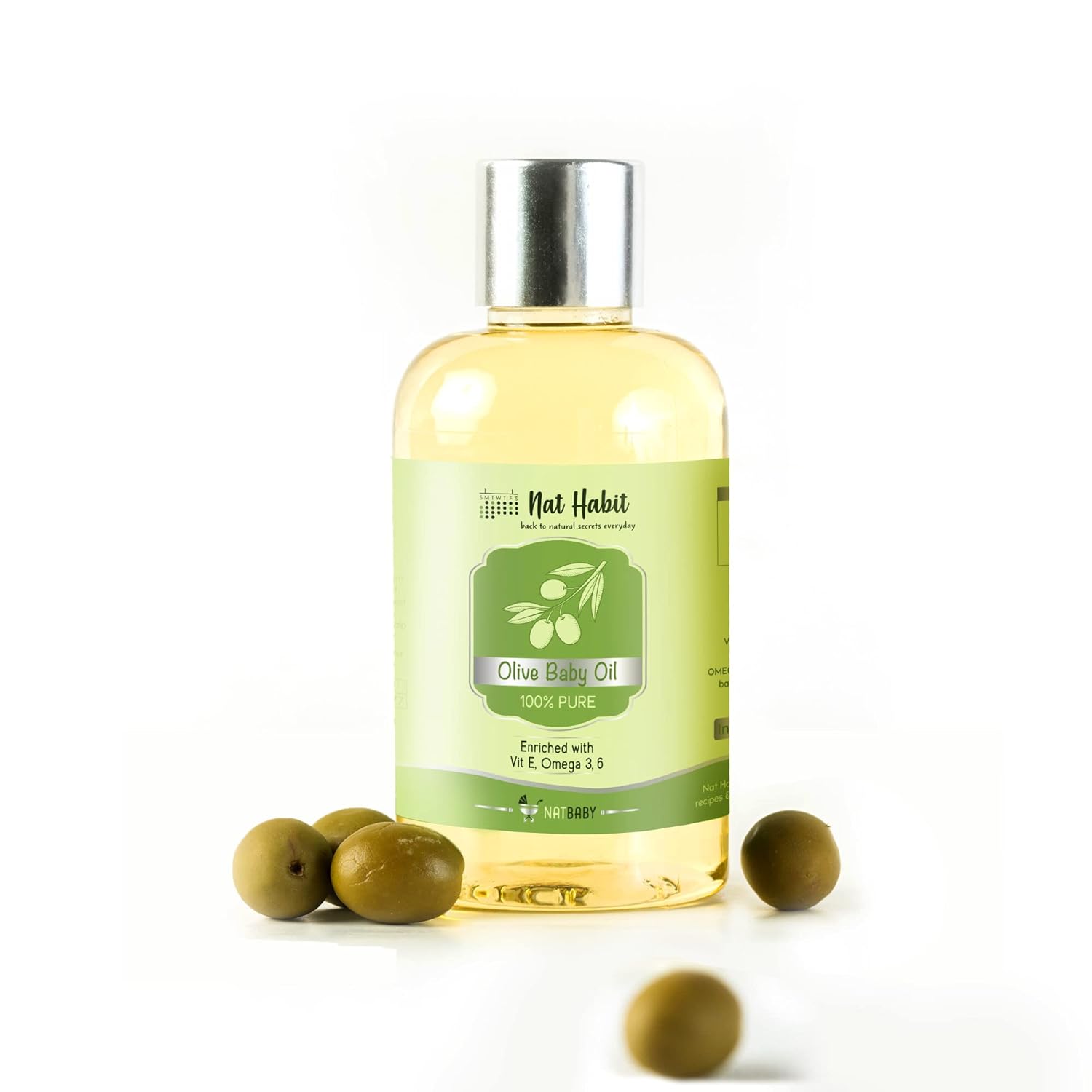 Nat Habit Pure Olive Baby Oil (100ml) is a gentle, non-refined Ayurvedic blend crafted to nourish and protect your baby’s delicate skin and hair. Made with 92% pure olive oil and enriched with Vitamin E, Omega-3 & 6 fatty acids, and cold-pressed almond, walnut, and flaxseed oils, this formula supports healthy growth, immunity, and hydration. Free from chemicals, preservatives, and mineral oils, it’s ideal for daily massage, moisturizing, and bonding rituals.