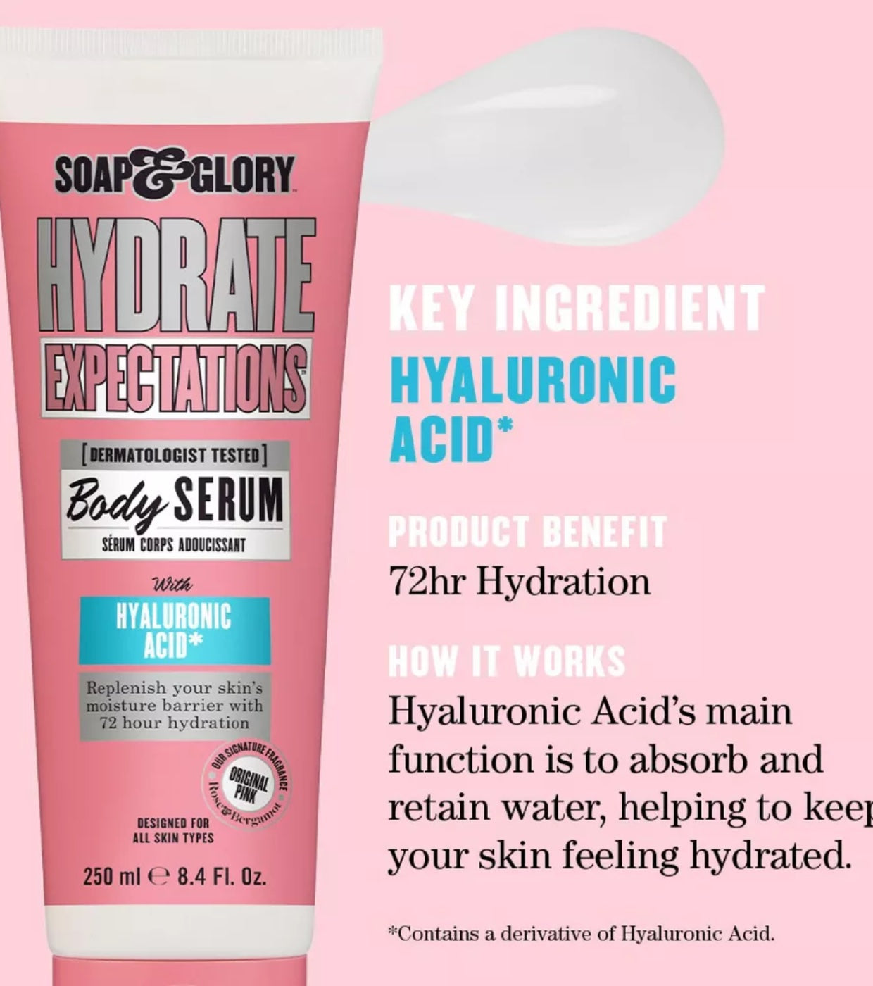 The Soap & Glory Hydrate Expectations Body Serum 250ml is a moisture‑boosting body treatment formulated to quench dry, thirsty skin with a blend of hydrating actives and skin‑loving ingredients. Its silky, serum‑like texture absorbs quickly without greasiness, leaving skin feeling soft, supple, and beautifully conditioned. Perfect for daily use, this serum helps improve skin smoothness, supports moisture retention, and enhances overall radiance.