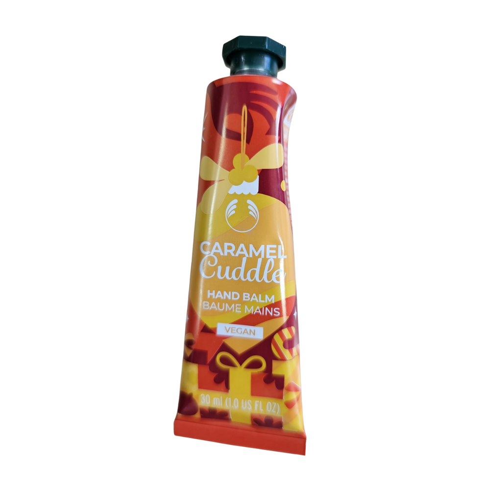 Caramel Cuddle Hand Balm (30ml) – warm, comforting caramel-scented balm that nourishes and smooths.