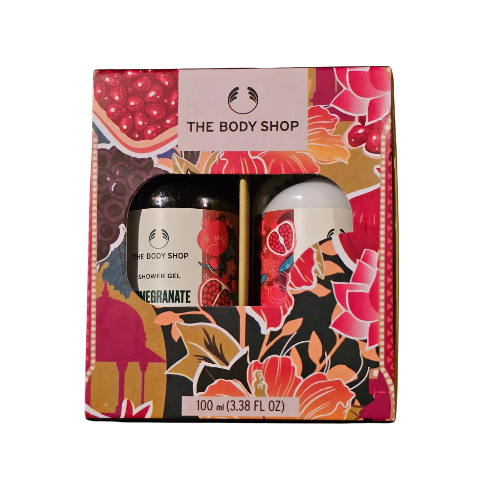 The pack includes a Pomegranate Shower Gel (Sweet & Refreshing, 50ml) and a Pomegranate Body Lotion (Sweet & Refreshing, 50ml).